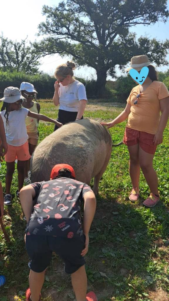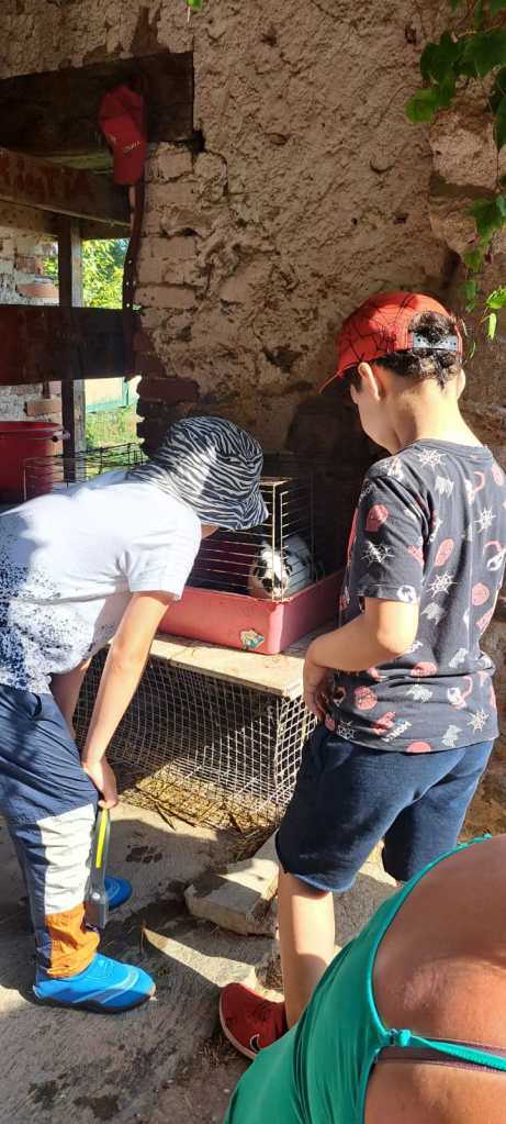 Ce matin, après avoir pris le petit-déjeuner et rangé nos yourtes, nous sommes partis nourrir les animaux avec Violaine. Nous avons vu une truie, des lapins, des poules, des biquettes, des cochons d’indes et des vaches.
