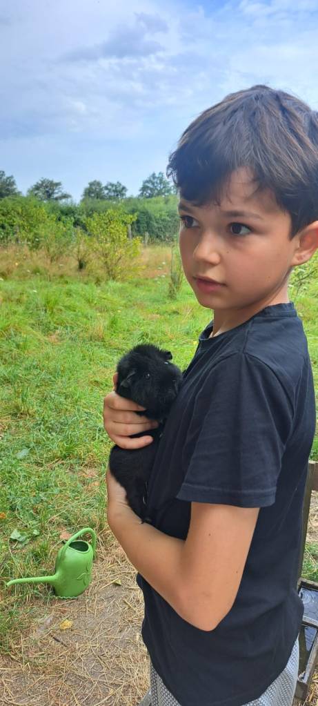 Ce matin on a nourrit des animaux. J’ai vu des lapins, des coques et des cochons dinde et après j’ai vu un gros cochon. Le gros cochon essayait de s’échapper de son enclos.