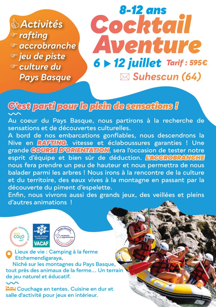 A bord de nos embarcations gonflables, nous descendrons la Nive en rafting, vitesse et éclaboussures garanties ! Une grande course d’orientation, sera l’occasion de tester notre esprit d’équipe et bien sûr de déduction. L’accrobranche nous fera prendre un peu de hauteur et nous permettra de nous balader parmi les arbres ! Nous irons à la rencontre de la culture et du territoire, des eaux vives à la montagne en passant par la découverte du piment d’espelette.